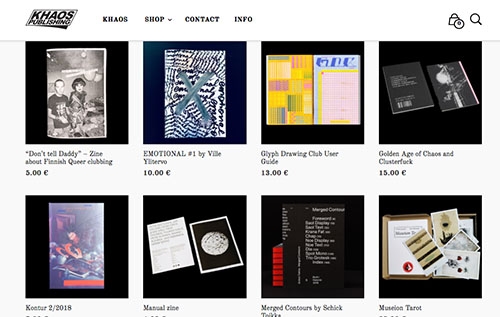 Khaos Publishing is an independent publisher and a shop for indie publications based in Helsinki, founded in 2014 and launched in 2015. Khaos' intention is to support artists by promoting their work and by giving the artists a better deal on selling their works than the average reseller or publisher does. Khaos offers a curated selection of books, magazines and zines on art and society. The focus is on meaningful and independent publications.